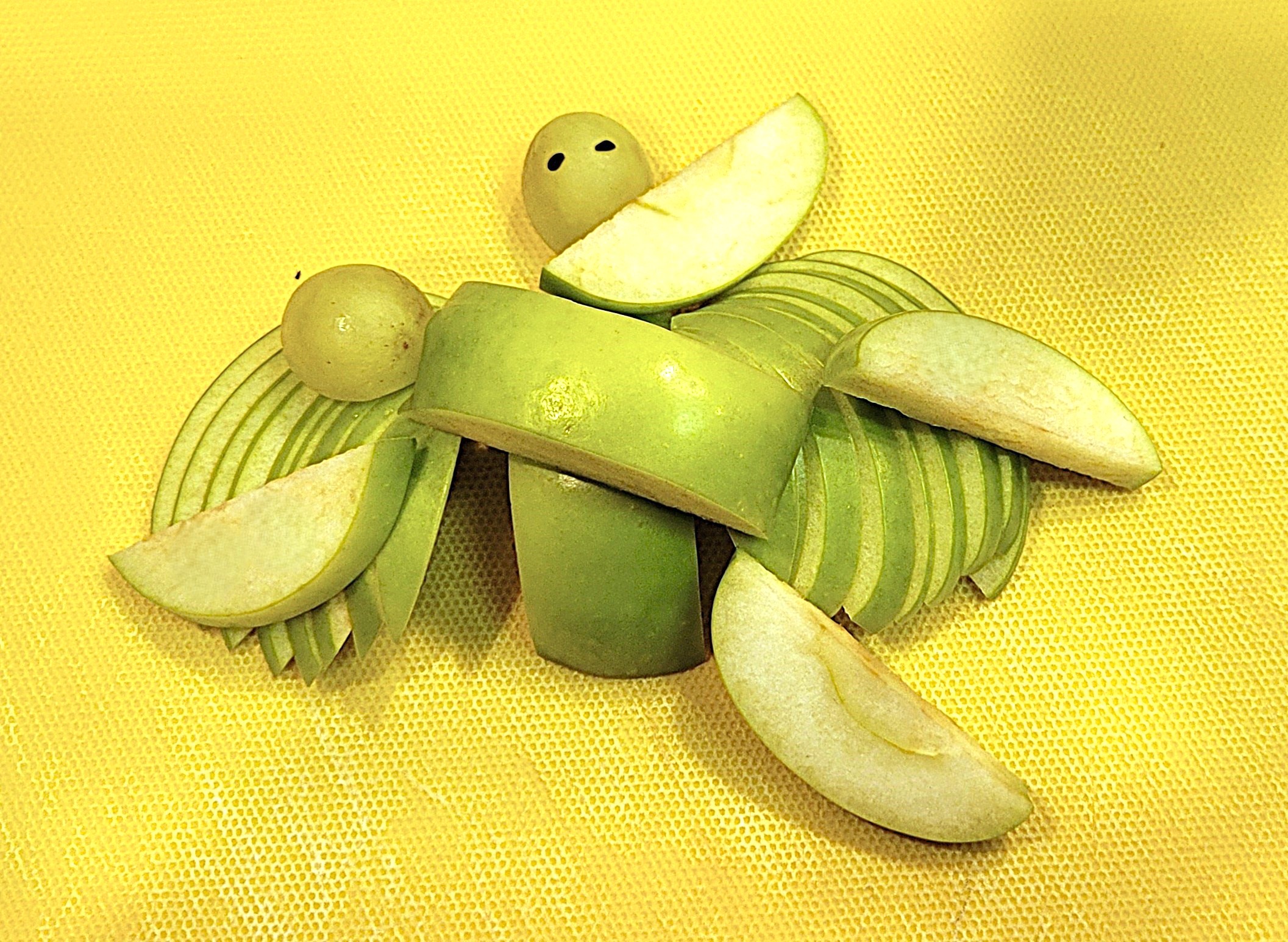 Ingredients as shown: Tools: Instructions: 2. Mix and match the apple slices, as shown, to create stripes. Add a toothpick “neck.” 3. Add toothpick arms and legs…. … a head and feet. If I made it today, I would have added black sesame seed eyes. But given my nostalgia for this first Parsha Nosh, I