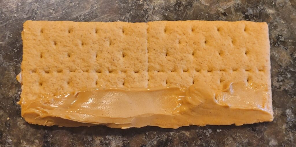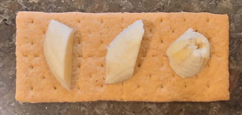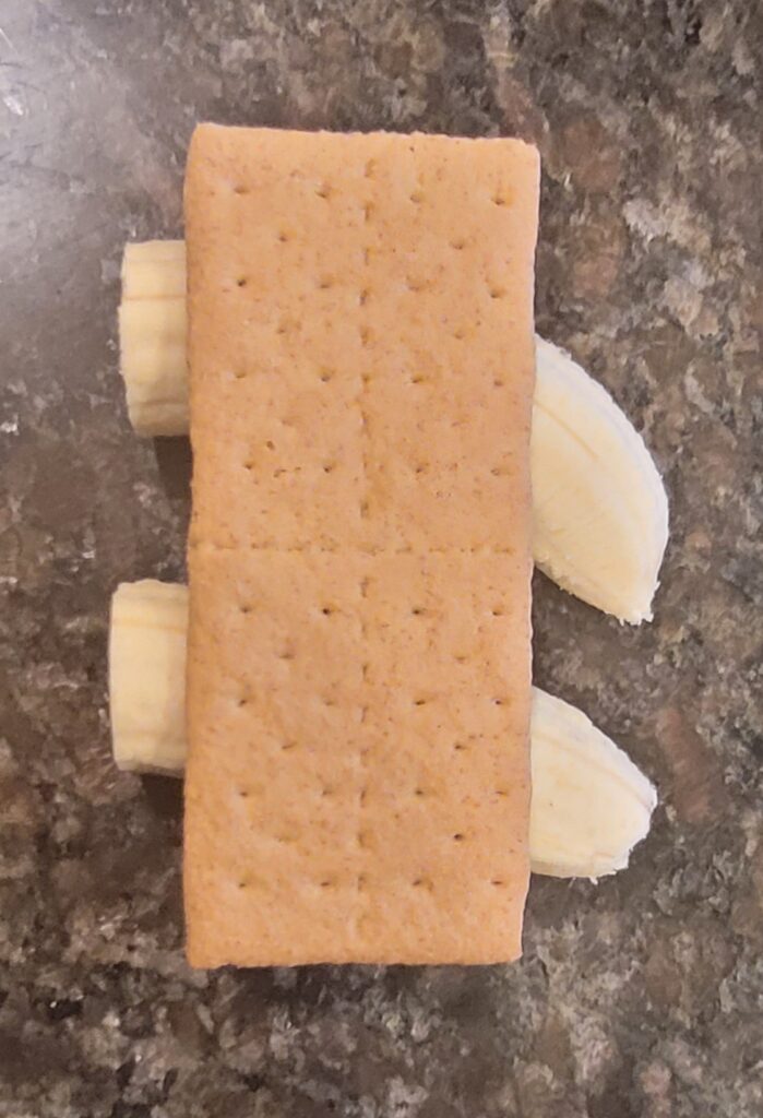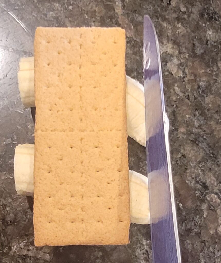 - Cut banana in half crosswise. Place roughly parallel, and place a graham cracker sheet so that you are sure both sides of both banana halves reach to each side of the graham cracker. Bananas are curved, so don’t worry if they reach different points on the sides.