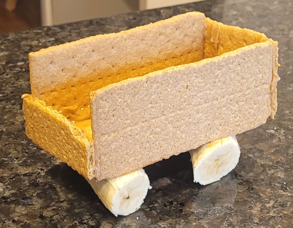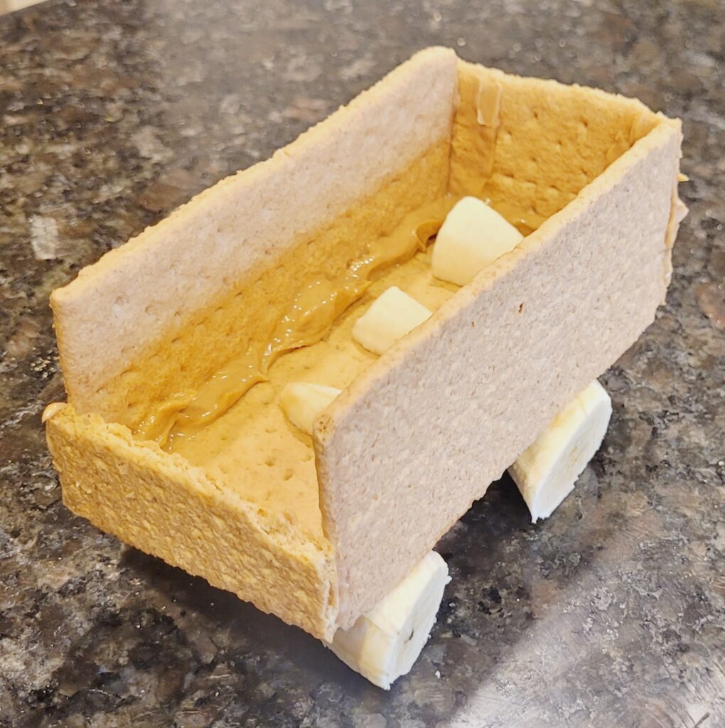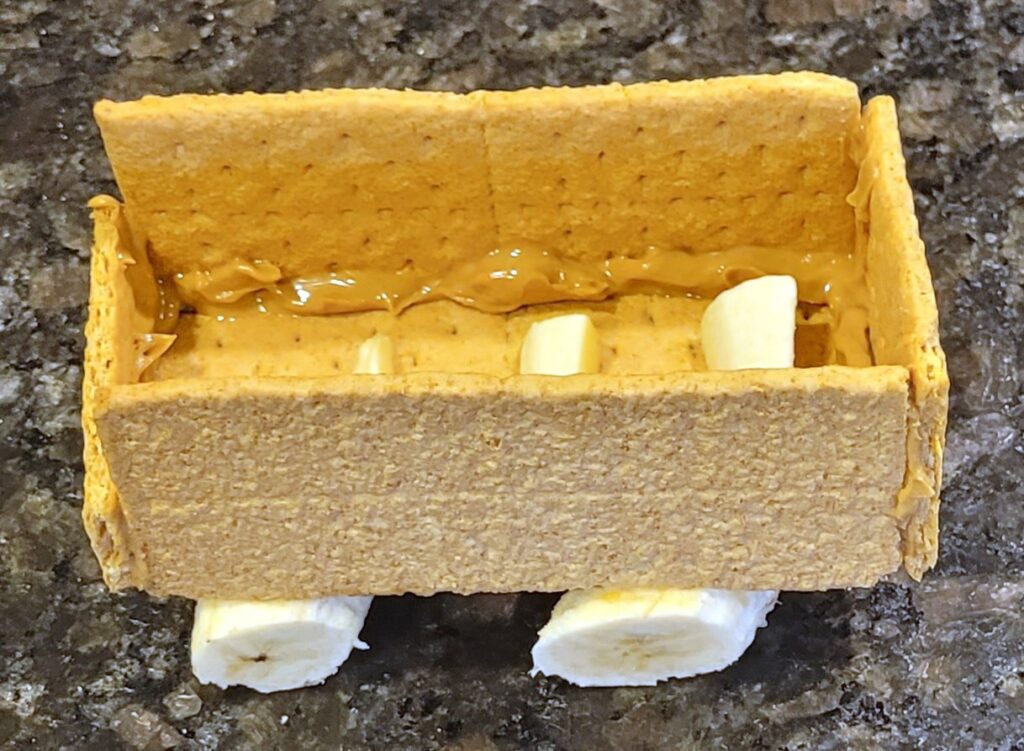 3. Remove graham cracker sheet from bananas, place on work surface. Cut portions of banana that were cut off, place on graham cracker to make seating for wagon.