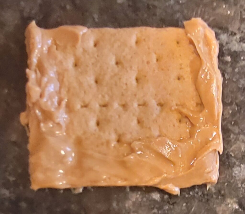 5. Take one of the graham cracker sheets, snap in half crosswise along the markings. Spread nut butter or sugar glue along three sides. Taking another, long sheet, spread nut butter or sugar glue along the bottom.
