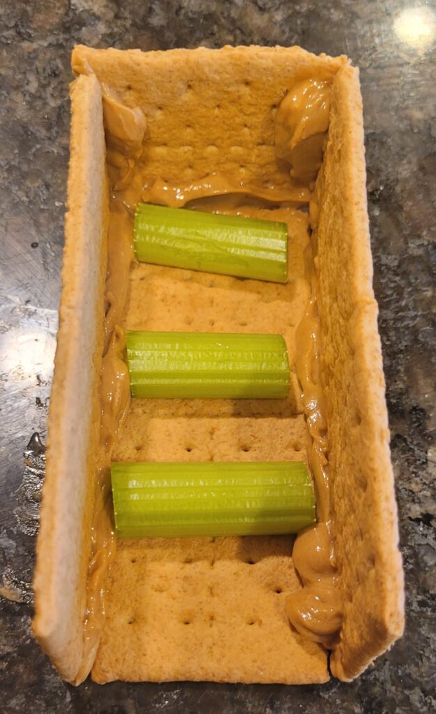 6. Place new pieces along top and side of bottom piece. (note seating shown is celery; it was a prior experiment). Repeat with third long piece.