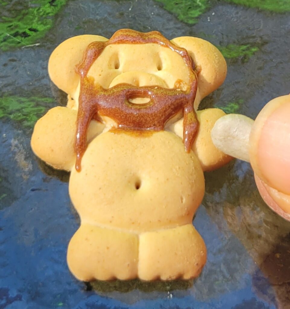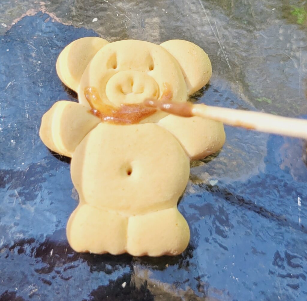 - Take one small bowl, add the hot cocoa mix and add water, a few drops at a time, to form a paste. Use one of the toothpicks to paint hair and a beard on some of the bear cookies.