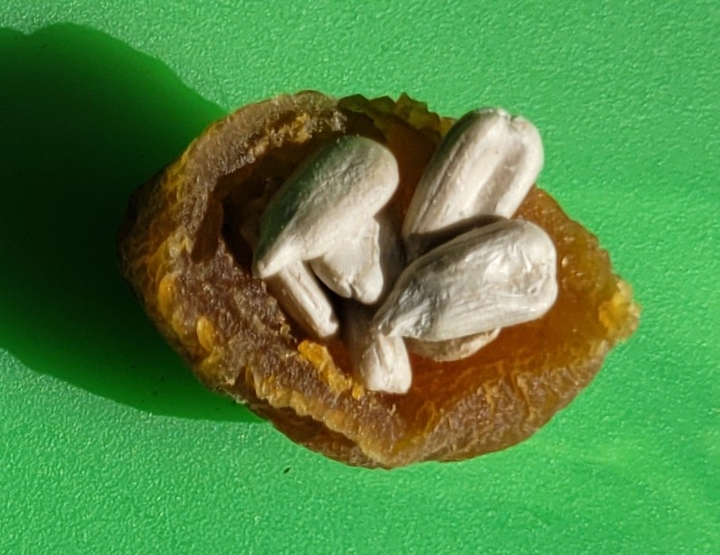 6. Cut the date in half crosswise, then cut enough from the end to form a flat edge. Open the date to form a basket. Fill with sunflower seeds.