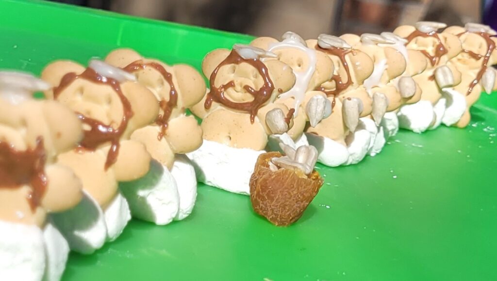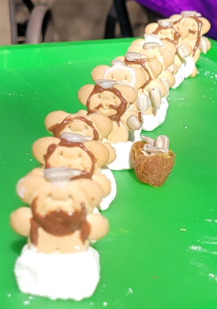 4. Following the instructions HERE, cut marshmallows and attach to front and back of the “men” to make them stand up.