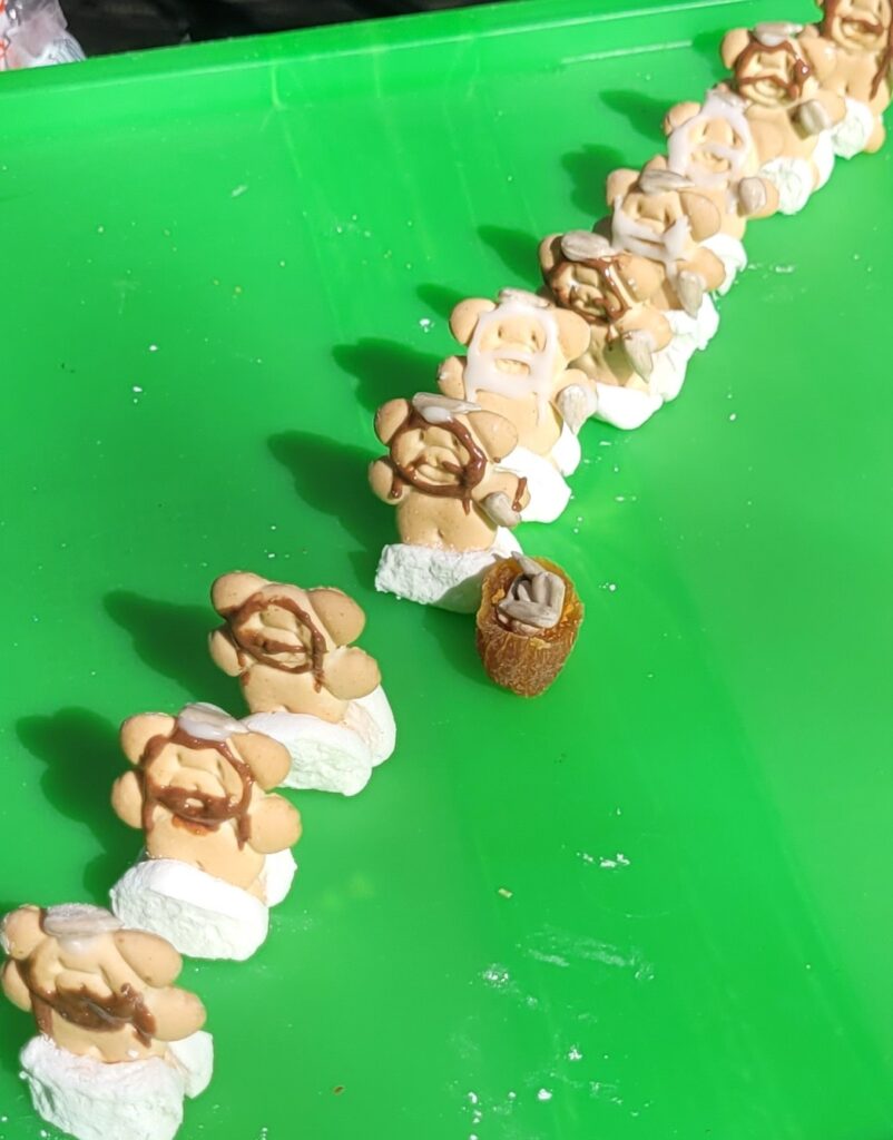 3. One bear at a time, put a dot of the powdered sugar paste on one of the “hands,” and add the sunflower seed “coin.” Repeat with most but not all of the bears, as some will have already donated their coins.