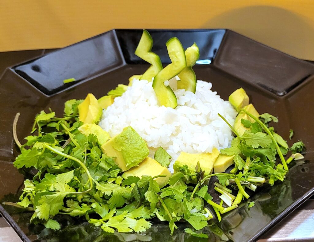 4. Surround the “mountain” with avocadoes and cilantro and cucumber cuttings, to represent greenery (plus it’s tasty).