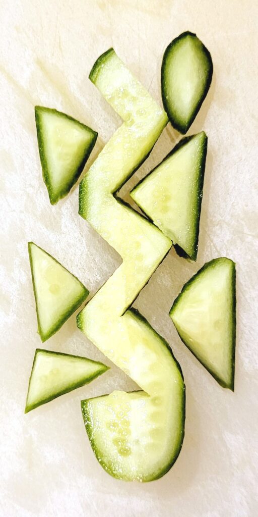 2. Slice sides off of cucumber (shown is a cocktail cucumber). Cut the sides into a zigzag pattern to represent lightning (the text says G-d spoke through thunder, but I could not figure out how to depict sound). Do not use the center that has the seeds; it will be too soft. Use that around the rice or just munch on it.