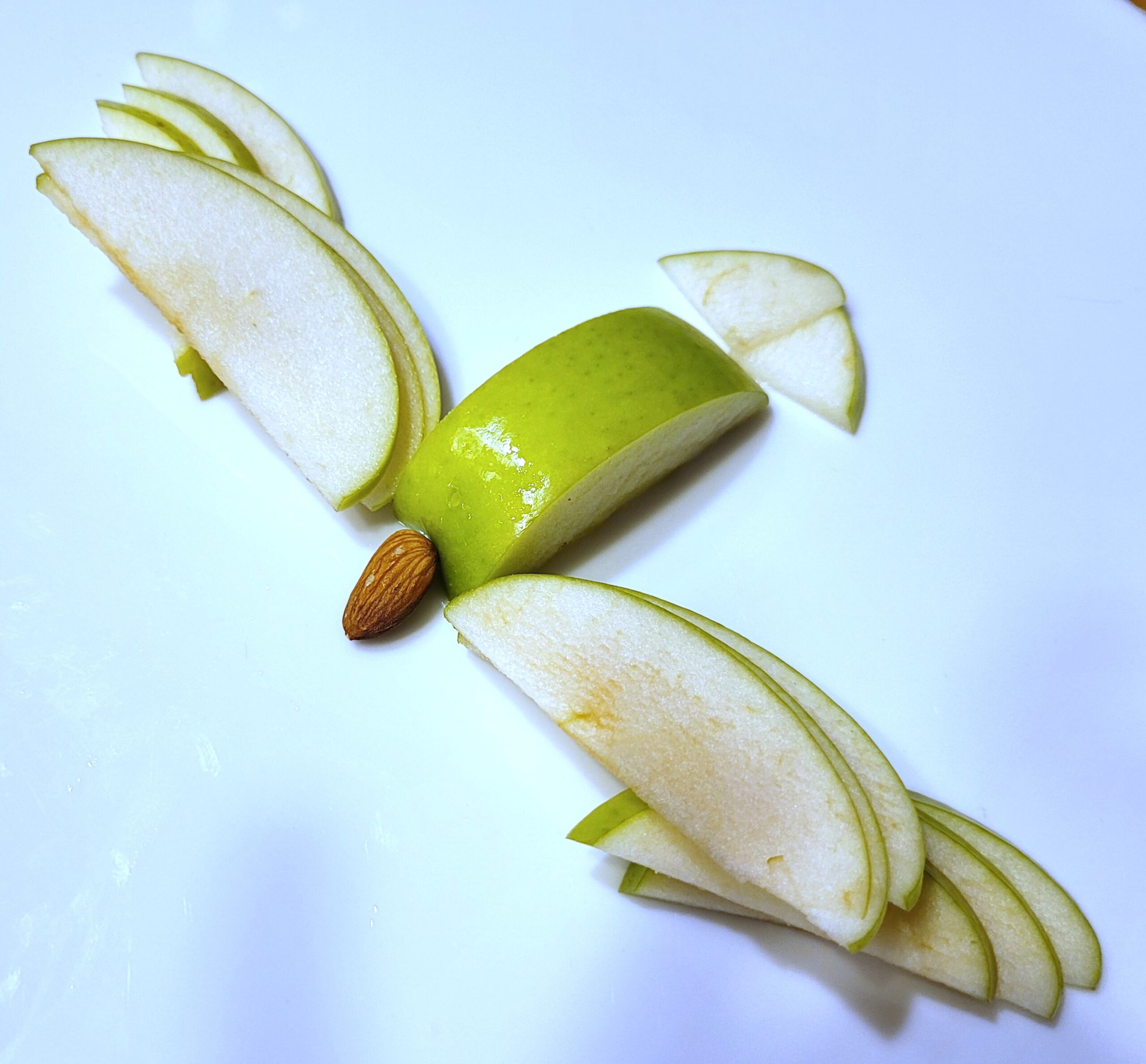 - Cut two sides of the apple so that you have whole rounds. Slice thinly to make wings.