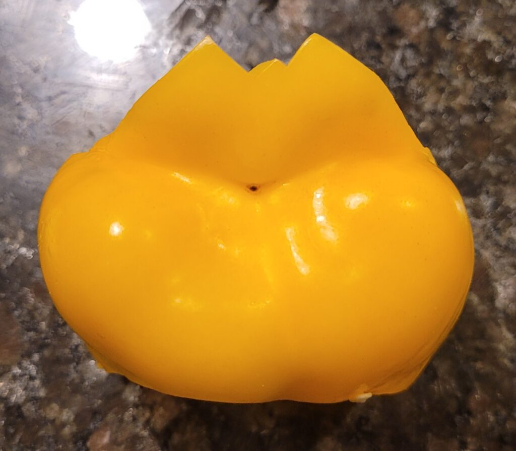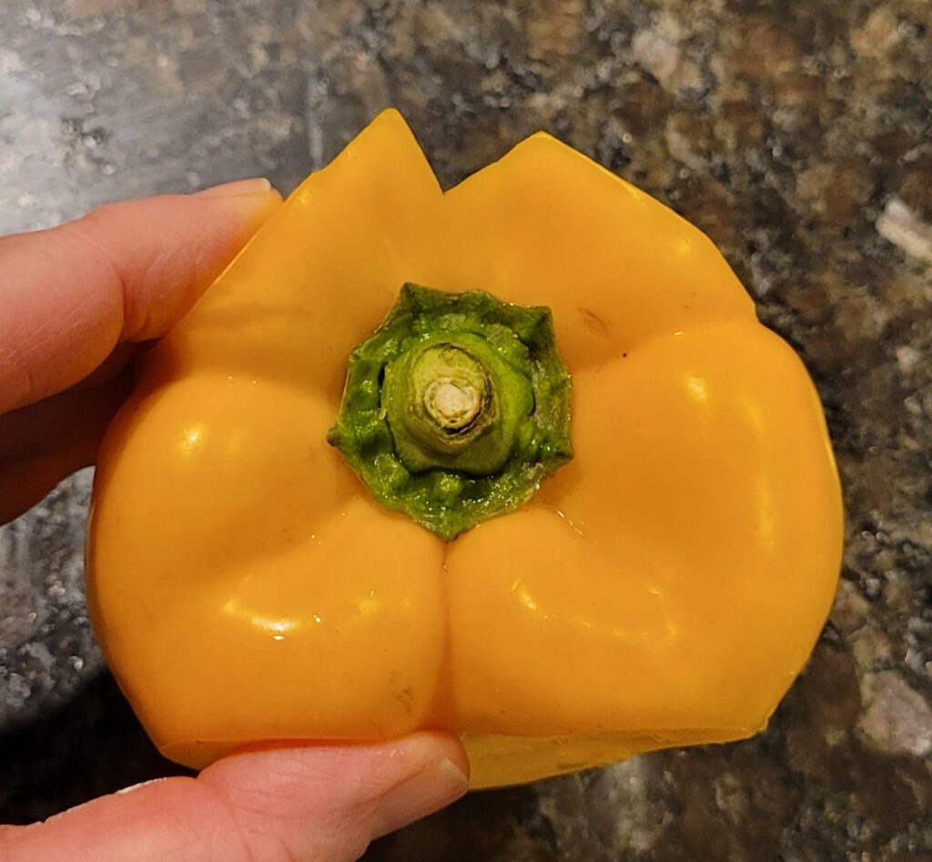 3. Looking at the pepper from the side, cut a small part of the bottom off so that when the pepper is placed on the surface, the top edge of the boat is parallel to the bottom (or pretty close).