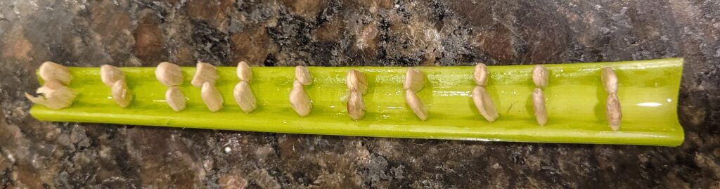 8. Taking another stalk of celery, determine length you want the ramp to be. Avoid trimming very much of the top end. Cut to length, then cut the sides so that the end of the “ramp” can fit in the “door” (which is why you want the narrow, top end.