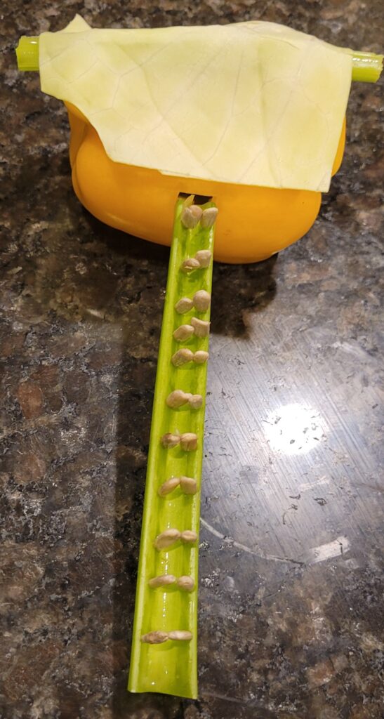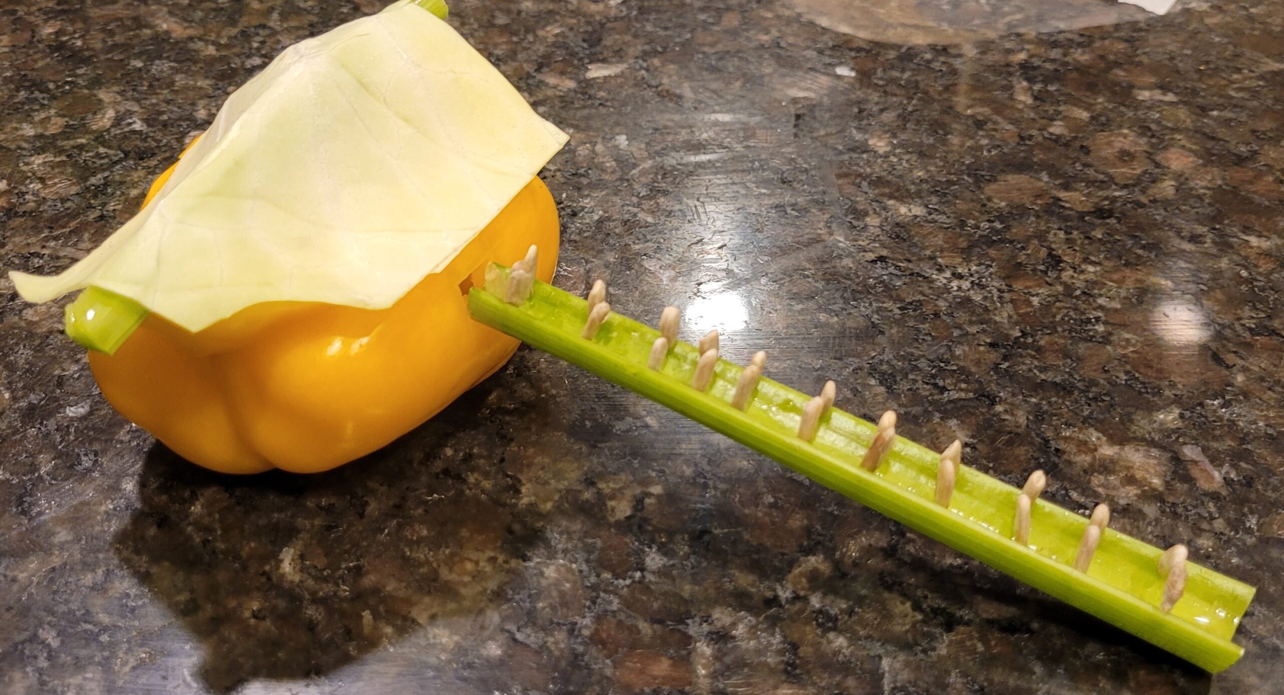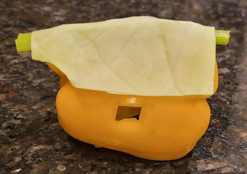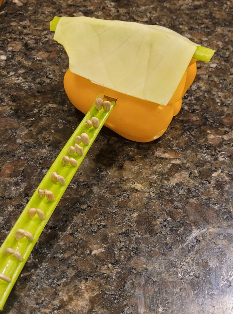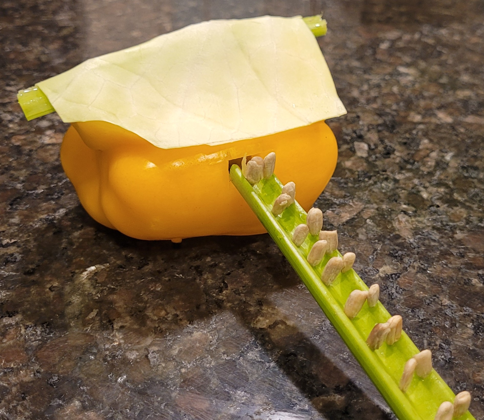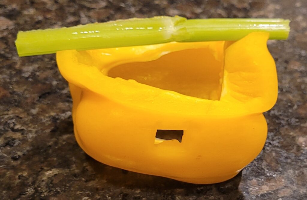 6. Slice a celery stalk so it is longer than the edge to edge of the pepper (longer is ok). Trim so that it is thin enough to easily fit in the notches on the edges of the pepper. Put in the notches.