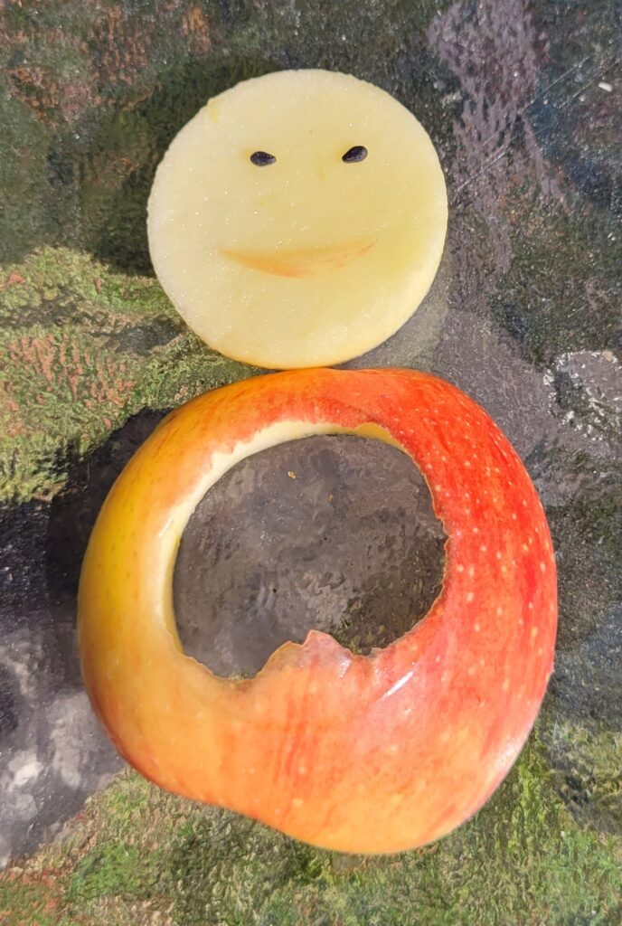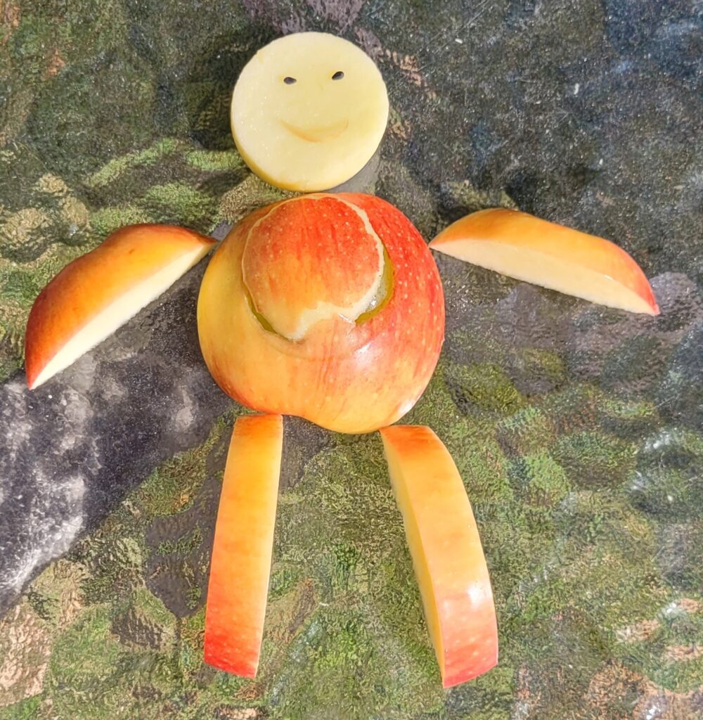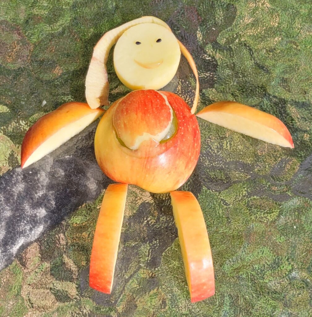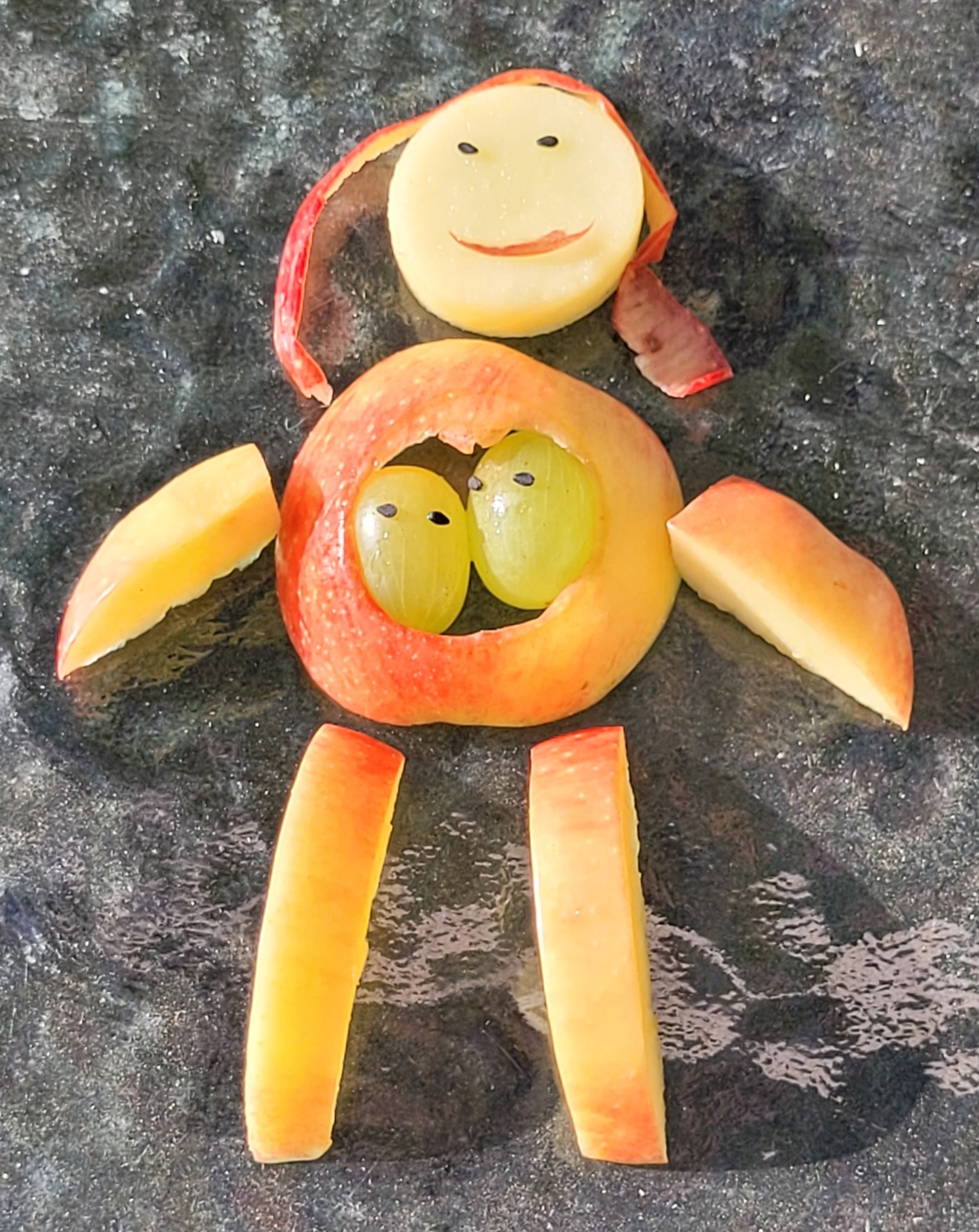 7. Put center cut apple above for the “head.” (note: the center part is not in these photos; I decided on that instruction after having already taken the photos)