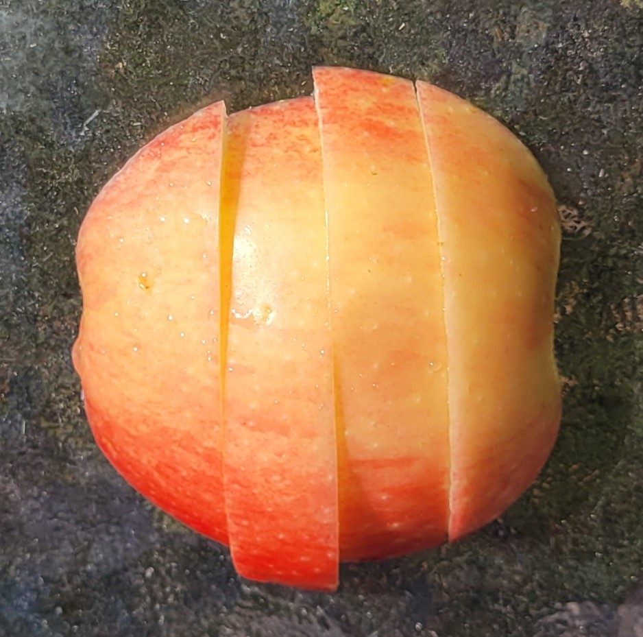 5. Cut a tiny sliver off of any part of the apple to make a mouth, and a large part for the “hair.”