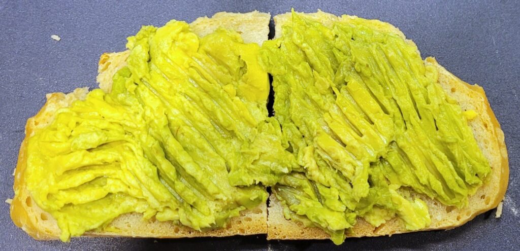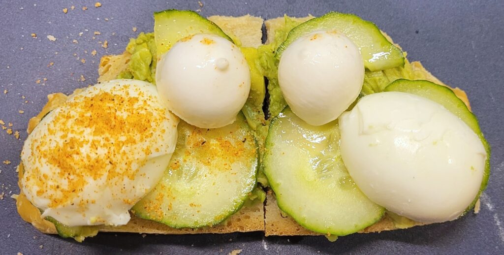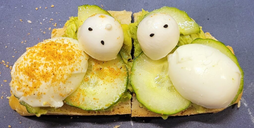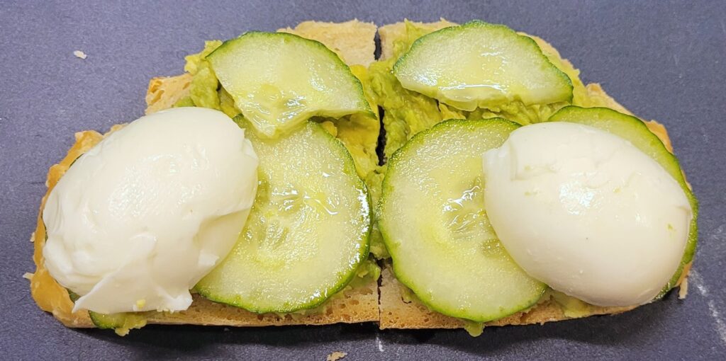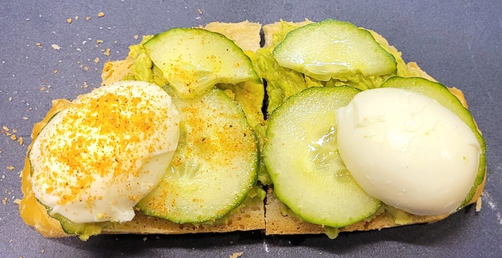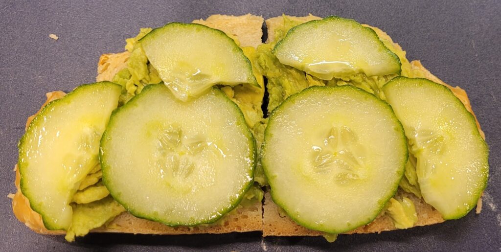 1. Put what you want to go on the sandwich under the eggs and cheese. In my case, it was mashed avocado followed by sliced cucumbers, but make it what you want!