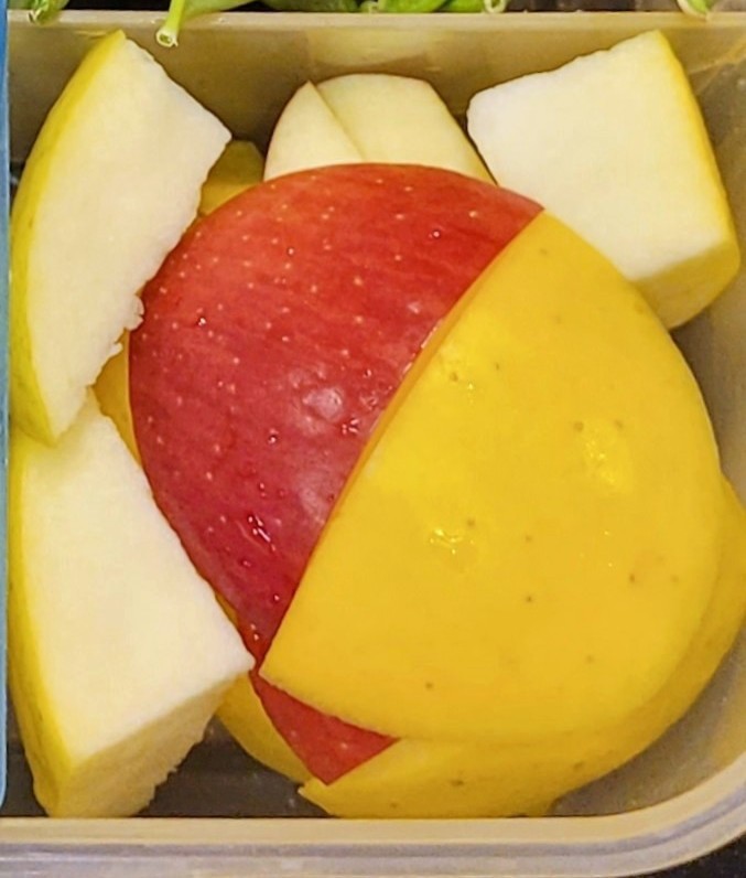 5. Add “fraternal apples”: Take apples of two different colors. Cut the first, round slice from each of about the same size. Set aside. Cut the other apples to fill the container, top with the two ends.