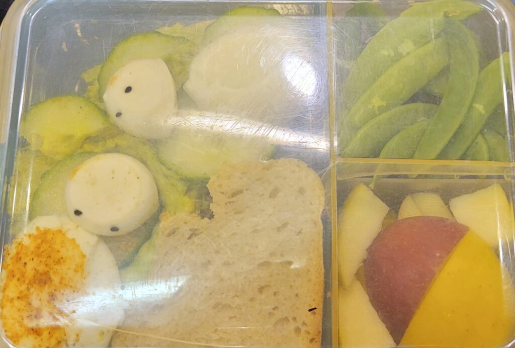 This will vary depending on the size and shape of your lunch box and bread. You may also prefer to use something else under the eggs and cheese. It still has to taste good to the eater!