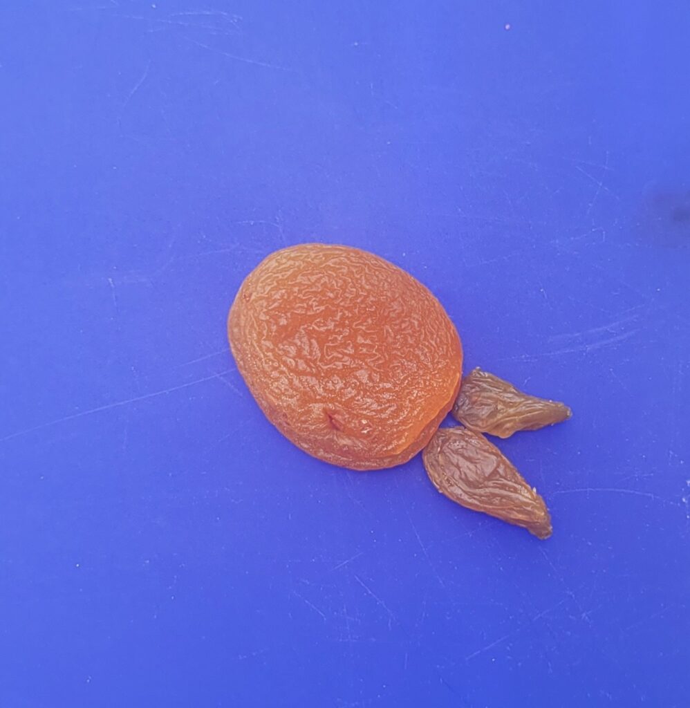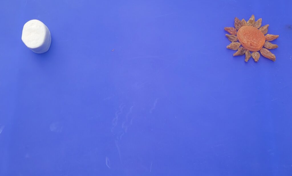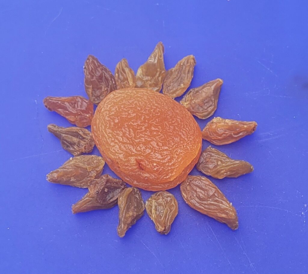 2. Taking one golden raisin at a time, flatten one side and pinch the other. Arrange around the “sun” (optional).