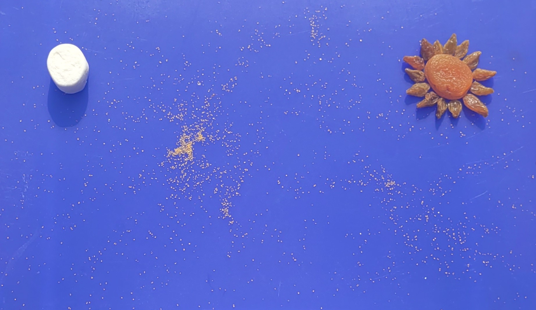 2. Taking one golden raisin at a time, flatten one side and pinch the other. Arrange around the “sun” (optional).