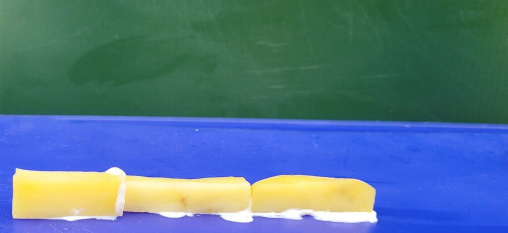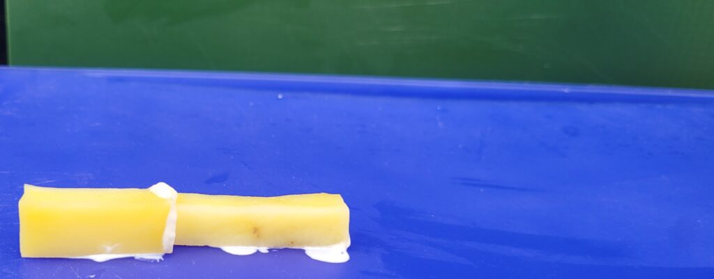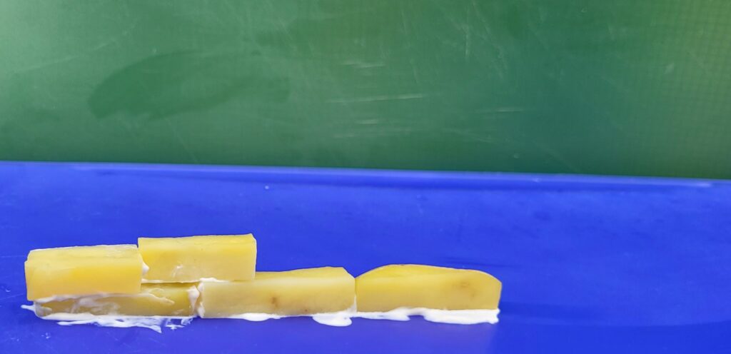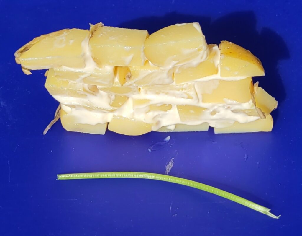 - TO PREPARE: Cut potato into long “bricks.” Try to make the height relatively even. For younger children especially, you will want to do this ahead of time to avoid too much frustration. A few short pieces for the ends to have offset layers will be fine. Be realistic about how much kids will eat; I hate to waste! Turn the cut off parts into potato salad.