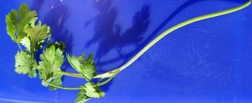 5. What motivated us? Fear, unfortunately. Take cilantro. Snip to desired size, remove leaves.